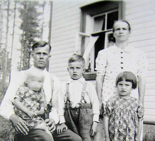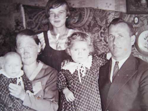 Paavo Lohjamo ja vaimonsa Paraskeva Vasiljeva Lohjamo os. Jenu. Vasemmalla Sievä äitinsä sylissä, keskellä Sirkka, kolmas lapsi Sakari vielä äitinsä kohdussa. Takana on lapsenlikka? |